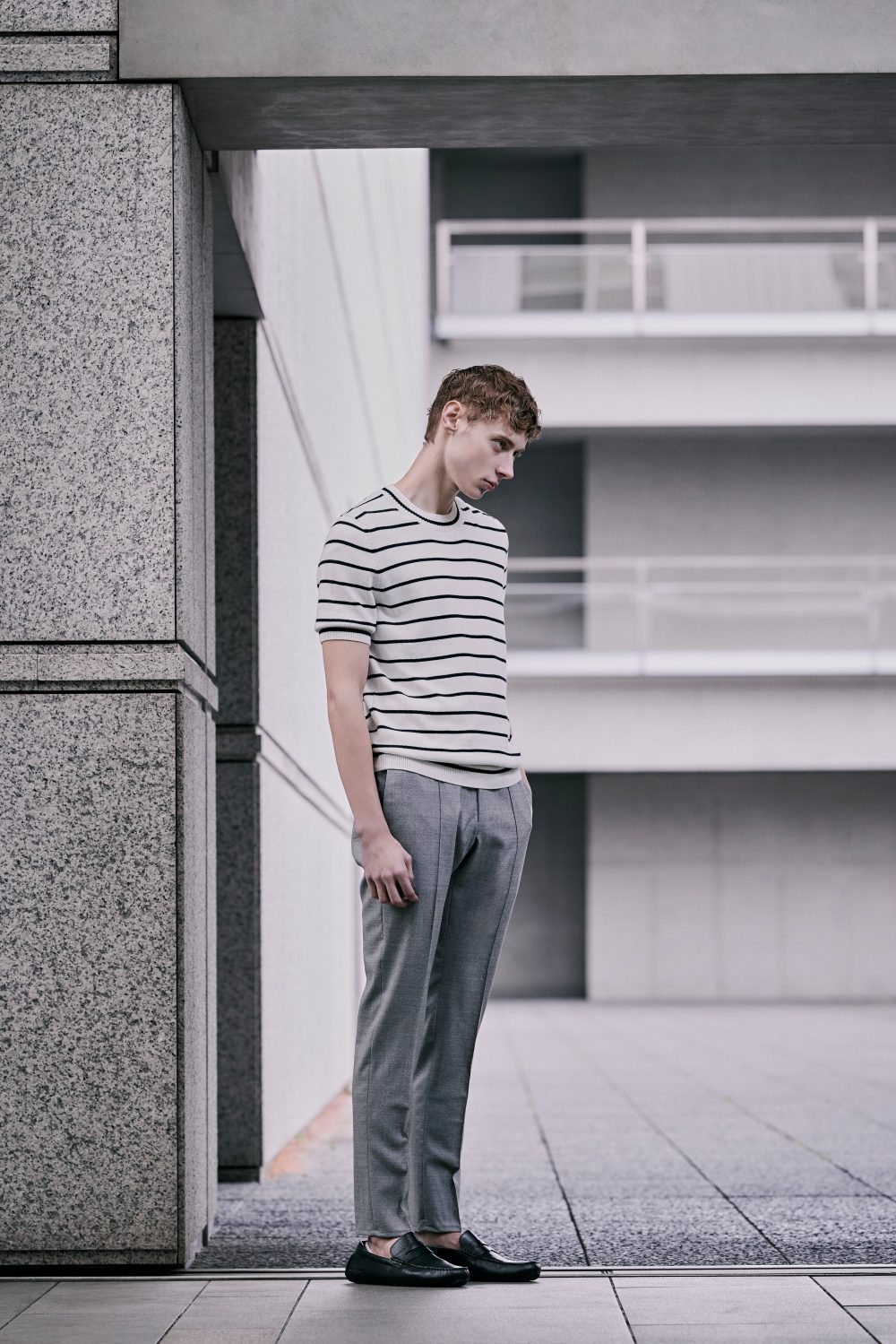 ウエストドローコード、両サイドのゴムシャーリングによる快適な穿き心地、脚を綺麗に見せるジャブスアルキヴィオならではの細身のシルエット、革靴、スニーカーのどちらにもフィットするユーティリティーリラックストラウザーズ。脚長効果のあるひざ上からのテーパードシルエットが魅力。